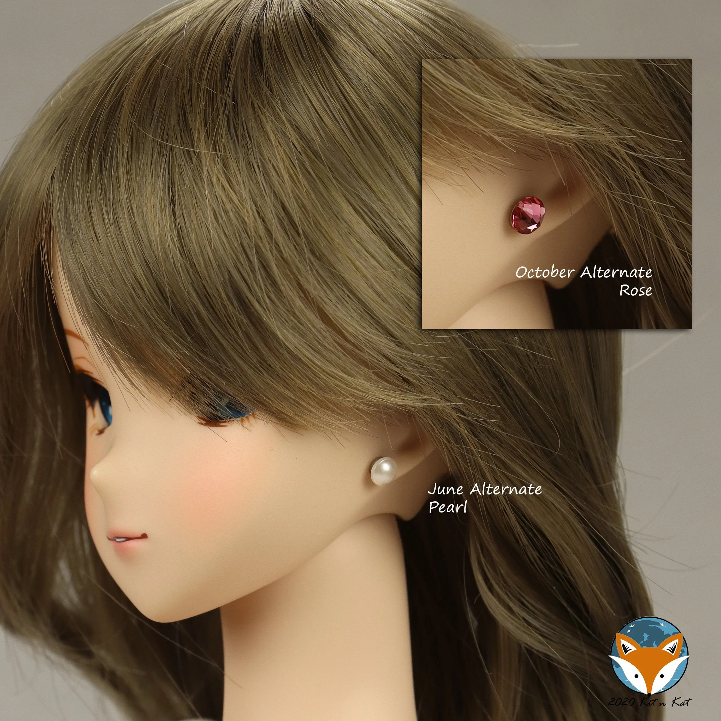 Smart Dolls have designer clothes. They have name brand shoes. They have style. What they don't have are earrings. Well, not unless you are willing to put a hole in a very expensive head... In order to give Smart Dolls the jewelry they want, without permanent alterations, we have developed this kit that uses powerful neodymium magnets to allow special jewelry to "cling" to their ears. Once installed, your Smartdoll can wear all of the earrings from our shop! These kits contain two earrings made with Swarovski crystals in 14 different birthstone options, and one smaller Swarovski "Diamond" bellybutton stud, along with everything you need to install the kit. Magnets have been tested and are strong enough to hold while posing or moving your doll, but light enough that they won't leave a lasting impression behind.